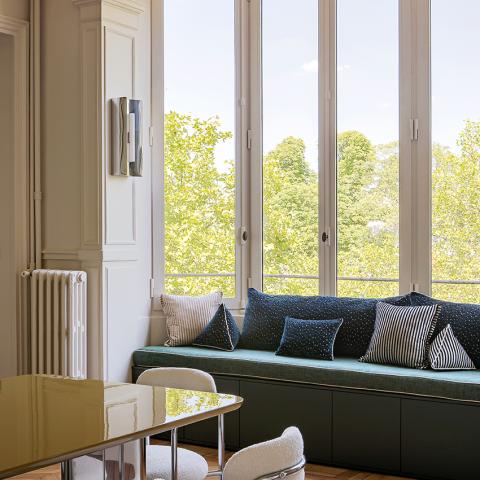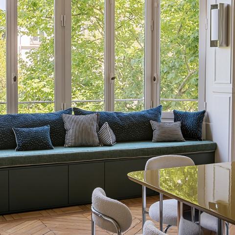Une cuisine pensée autour d’un îlot mêlant rangements et banquette pour créer un coin repas convivial.