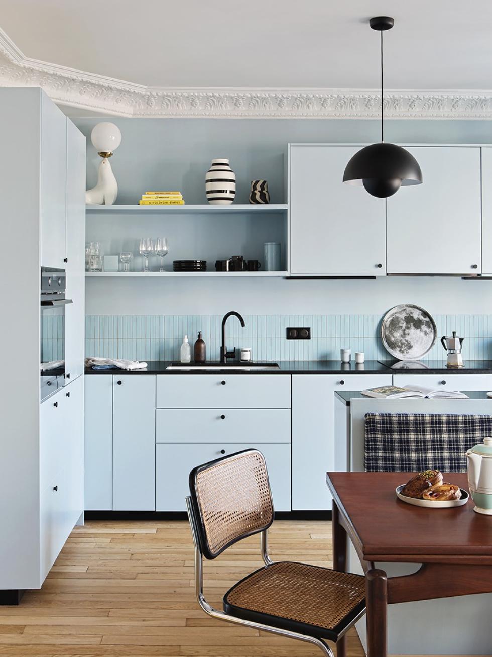 Une pièce, deux ambiances. Côté cuisine, Lisa a misé sur le bleu pour définir les espaces, du mur aux façades. “Je voulais une cuisine bleu ciel, qui a un côté années 50 que j’aime beaucoup, mais sans tomber dans le côté trop pastel ou trop layette.” Du mitigeur au plan de travail en pierre naturelle en passant par les plinthes et les poignées, elle a misé sur des accessoires noirs pour souligner son agencement et donner du caractère aux façades en laque mate lisse Ciel voilé signées Plum Living. “C’est un combo que je fais souvent dans mes dessins pour les vêtements, donc je savais que ça allait bien fonctionner”.