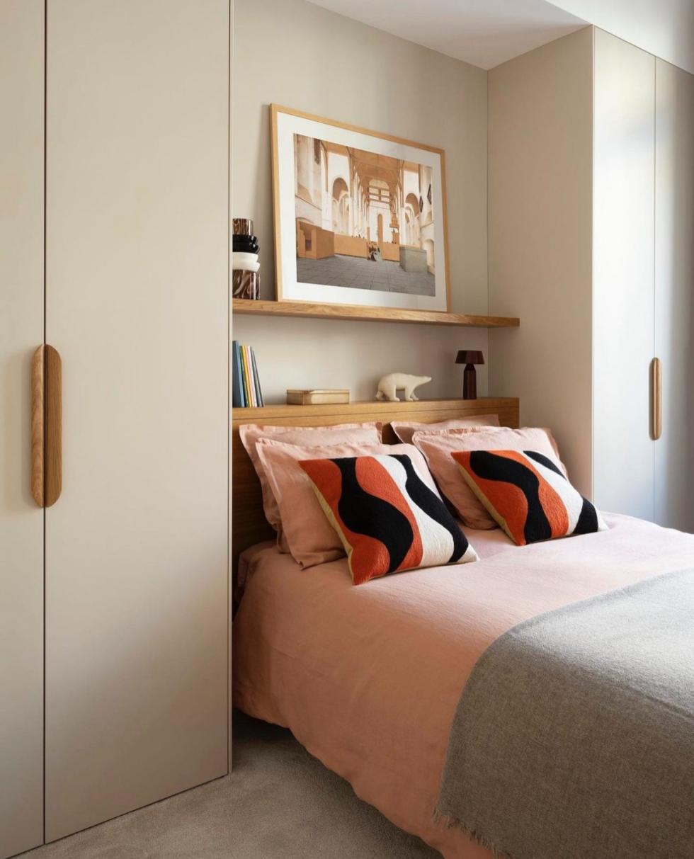 8 robes, 12 chemises et autant de vestes… promis, vous avez pourtant trié ! Il faut vous rendre à l’évidence : une commode ne suffira pas. Reste à savoir comment caser deux grands dressings dans votre chambre. L’architecte d’intérieur Fleur Delesalle s’est penchée sur la question pour ses clients. Installées de part et d’autre du lit, les penderies créent une alcôve qui pourrait être écrasante si elles n’étaient pas associées à une tête de lit. L’étagère flottante, elle, permet de relier les deux dressings et d’équilibrer les volumes. Déclinées dans la même essence de bois, les poignées achèvent de lier le tout.