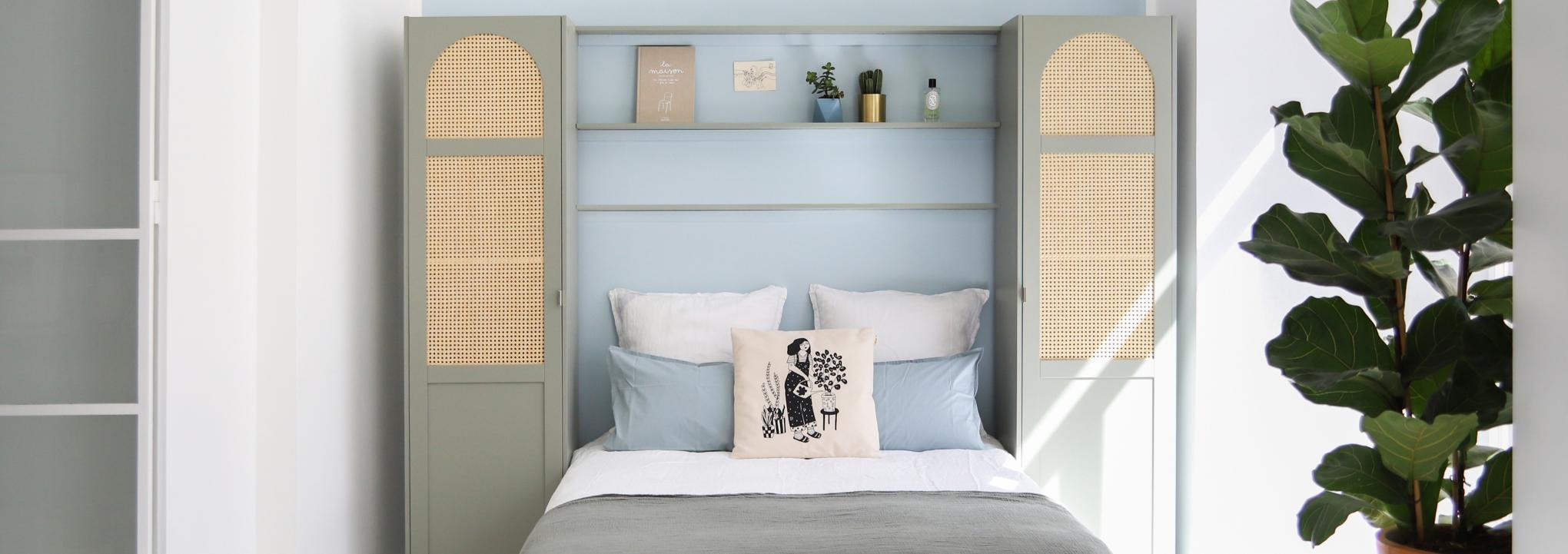 Imaginés comme des dressings, les caissons Pax vendus par Ikea peuvent également être détournés pour en faire des agencements singuliers. La preuve avec ces deux modules disposés pour créer une tête de lit : simplement installés de part et d’autre du sommier, ils sont reliés avec des panneaux de finitions utilisés comme étagères. Nos portes en cannage arche, elles, en font des objets déco, à mille lieues d’un placard basique !