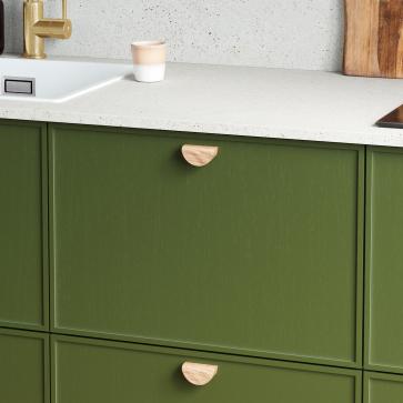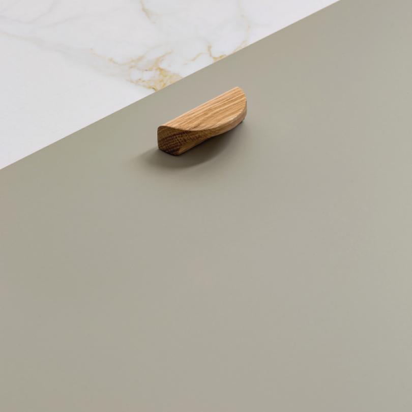 Poignée en chêne massif. Avec sa forme de demi-lune, elle se place aussi bien à l’horizontale qu’à la verticale pour créer des jeux de lignes sur vos façades. Disponible en 5 tailles.