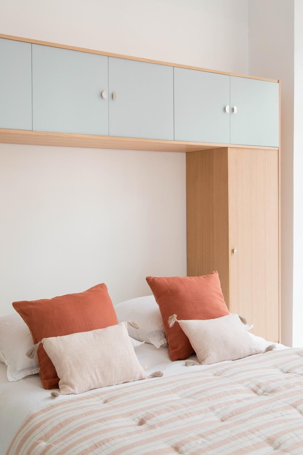 Projekt mit unseren glatten Fronten in Mattlack “Amandier grisé” und Eiche Natur, Griffe Mini-Lune Chrom. Bettwäsche von La Redoute und Gabrielle Paris