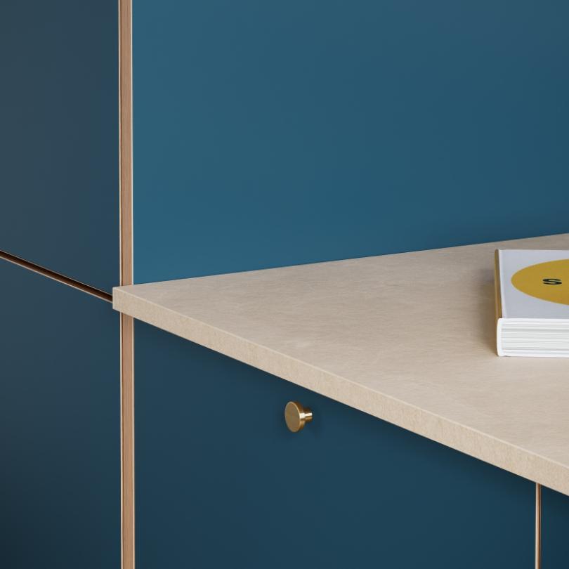 Arbeitsplatte aus Laminat mit beigem Steineffekt, das sich leicht strukturiert anfühlt.