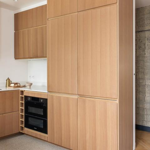 Structurée visuellement, elle se compose de deux colonnes reliées par des meubles hauts.