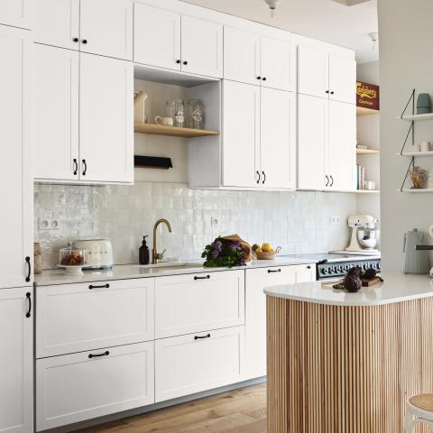 Portée par un piano de cuisson à l’ancienne, des étagères en bois et une patine réinventée, cette cuisine mêle charme et fonctionnalité avec une évidence rare.