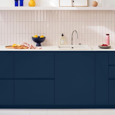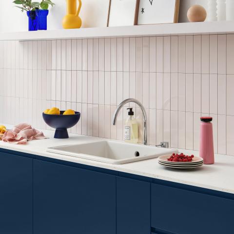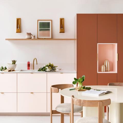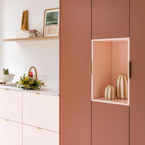 Le classicisme des portes à cadre Galet associé à un fond bicolore Argile et Blush.