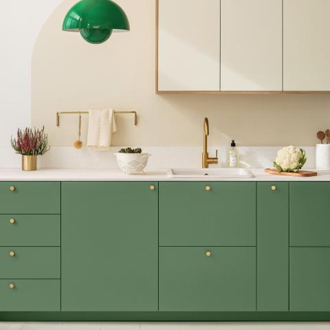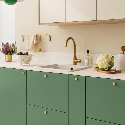 Un vert affirmé et des détails laiton, sur fond de rose poudré.