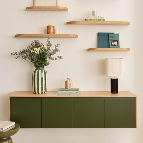 L'association de meubles Metod en partie basse, et d'étagères sur-mesure en partie haute.