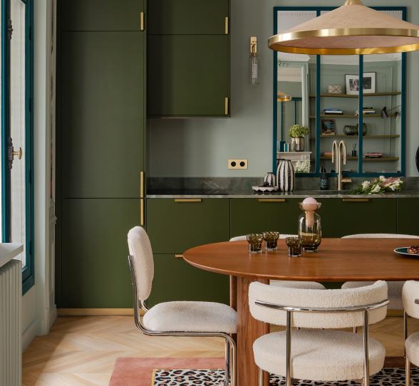Un bonbon, du sol au plafond ! Pensée comme une boîte, la cuisine Sorbet de Fanny Petit est sublimée par une peinture signée Ressource proche de la teinte de nos façades en laque. L’ancien vide-ordures, carrelé dans trois nuances différentes, apporte quant à lui une touche décalée à l’ensemble.