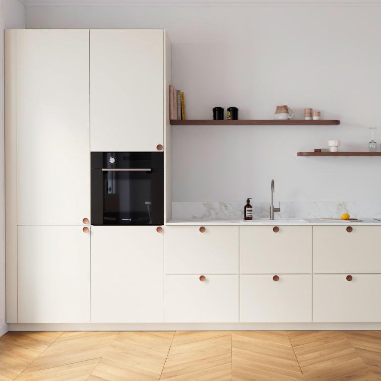 Un long plan de travail et quelques meubles hauts suspendus, pour un effet léger visuellement.