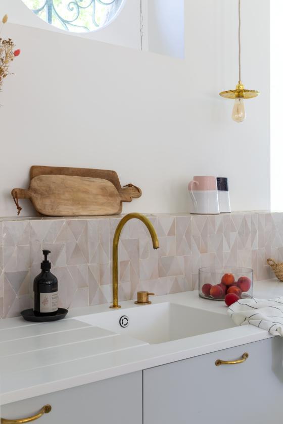 Quitterie combined our smooth Grey 01 - Gris nuage matte lacquer fronts with natural brass handles, Mosaic Factory zellige tiles for a traditional touch, as well as a Corian countertop. "I love this material, it's super hygienic and easy to maintain. It's exactly what dentists use!"