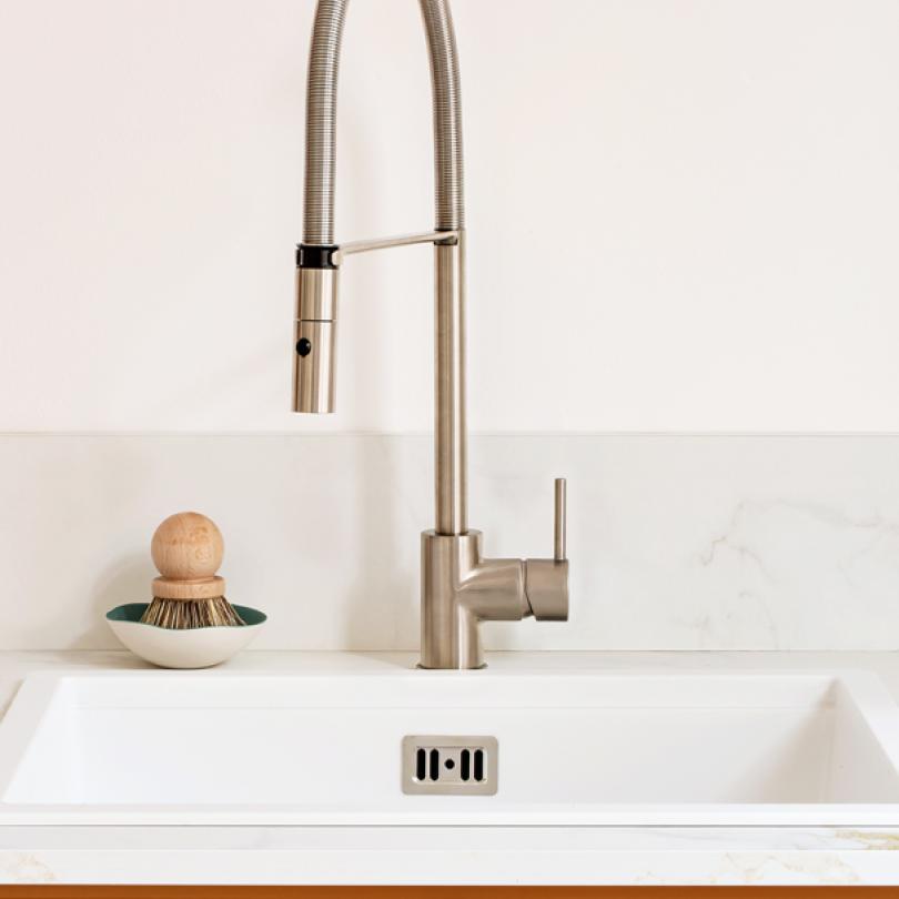 Solid brass kitchen tap, brushed nickel finish. Pull-out spray