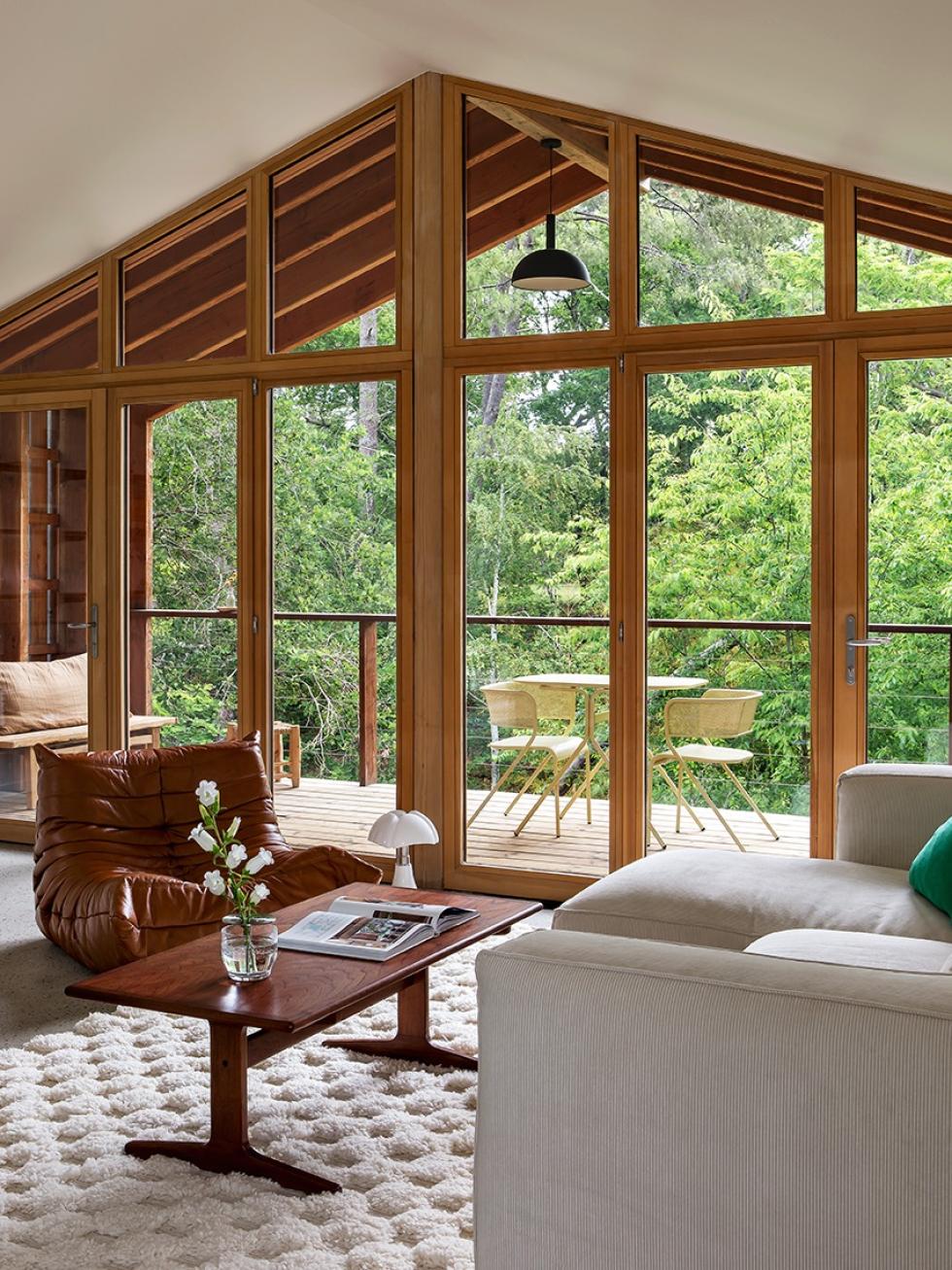 Just a quick look out of the large windows of the living room or a glance from the suspended patio, and you realise just how important a sense of nature is to Sabine's home. Nestled amongst the trees, this back to basics soul has naturally infused the decoration. "I wanted the focus to remain on the exterior, so I had to think paired-back for the interior design choices. We opted for raw, rustic materials, wood and cement, and for a simple colour scheme" . The only element that's attached to the wall, a bookshelf that Sabine fell in love with. For the rest, everything can be moved and adjusted: the furniture is, for the most part, vintage mid-century pieces which can be shifted closer to the fire for a cosy evening, or pushed to the window to catch some morning rays.